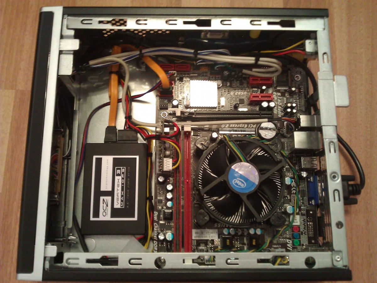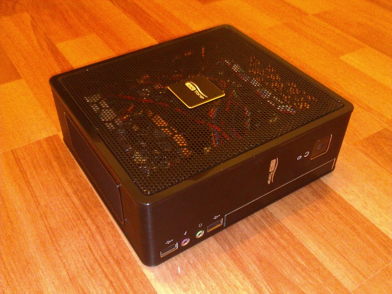 Корпус рассчитан на мат. плату mini-ITX, размером 17 х 17 см. Удалив комплектный блок питания, я освободил место для своей платы micro-ATX, имеющей размеры 17,5 х 23 см. Громоздкое крепление HDD и слим-привода тоже удалил за ненадобностью, обеспечив лучшую вентиляцию внутри корпуса.
