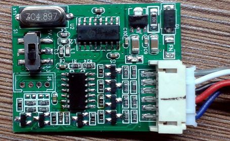 В приемнике пара микросхем, сам приемник на SYN470R и декодер. Приемник работает, на выходе есть сигнал. А вот декодер - глухо. Проблема в том, что бравые китайцы стерли начисто название микросхемы. Плата выглядит так: