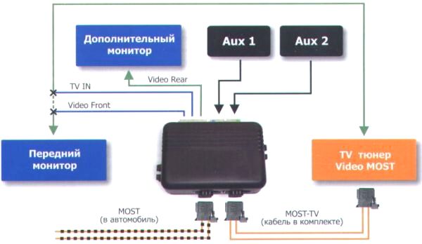 Модуль"AutoMOST-vxx" включается в разрыв оптической шины MOST и позволяет просматривать на заводском мониторе до двух видеоисточников. Все необходимые для установки нестандартные кабели и переходники поставляются в комплекте. При установке не нужно разрезать оптоволокно - шина оснащена специализированными разъемами, а подключение модуля продумано таким образом, чтобы свести работу по разрыву шины к переборке (что не сложно) оптического разъема.