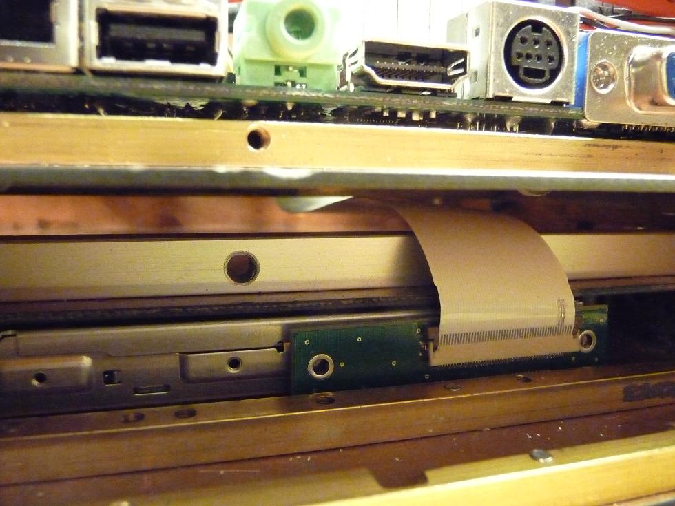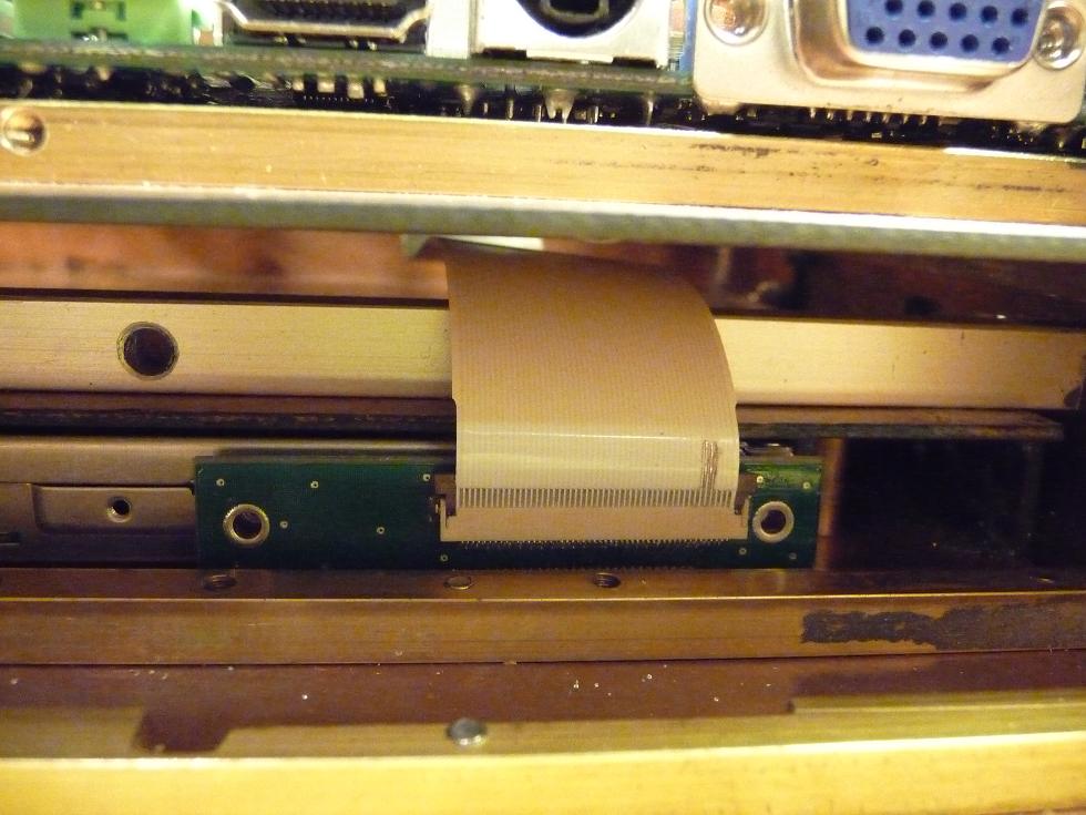 А это отдельная песня. Переходник с IDE 44 на SlimSD 50 с использованием сверхплоского кабеля. Такой переходник понадобился потому, что привод DVD перемещается, и использовать обычные шлейфы для приводов в этом случае некорректно да и к тому же громоздко.