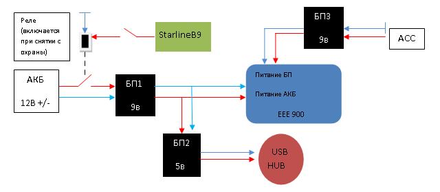 StarlineB9 - сигналка с автозапуском, при снятии с охраны подает напряжение на реле, которое в свою очередь запускает БП1 (т.е. при включении двигателя по автозапуску комп не включится). Кнопка добавлена для ручного отключения системы, например на СТО или мойке, когда машина с охраны снята но включение КарПС не требуется.