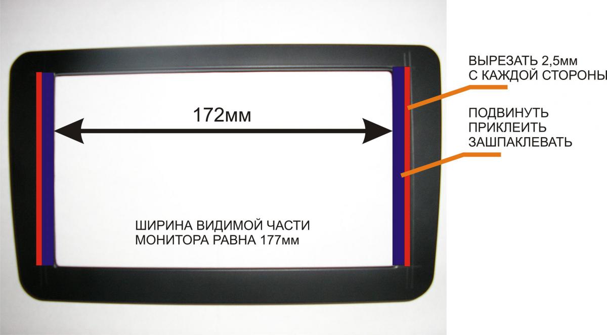 Есть другая идея. Рамку монитора не трогать, а работать только с переходной рамкой. Удлинить ее по горизонтали, вырезав с каждой стороны по небольшому сегменту, максимально сохранив при этом прилегающую к экрану кромку рамки. Примерно будет так: