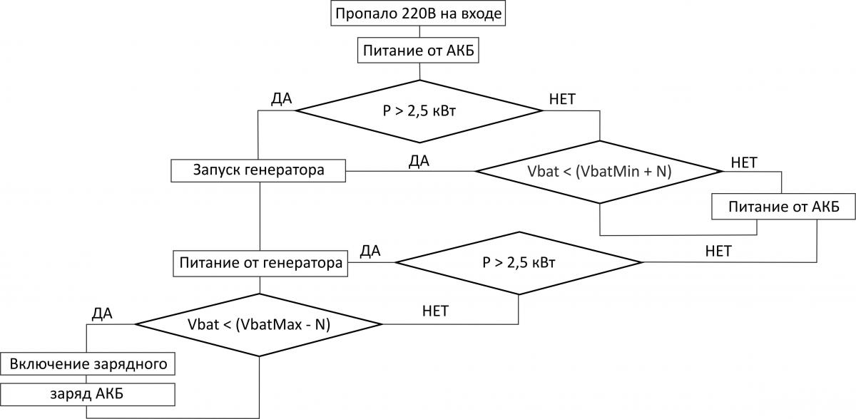 Инвертор самостоятельно отключит преобразователь и начнет подзаряжать батареи от бензо-генератора.