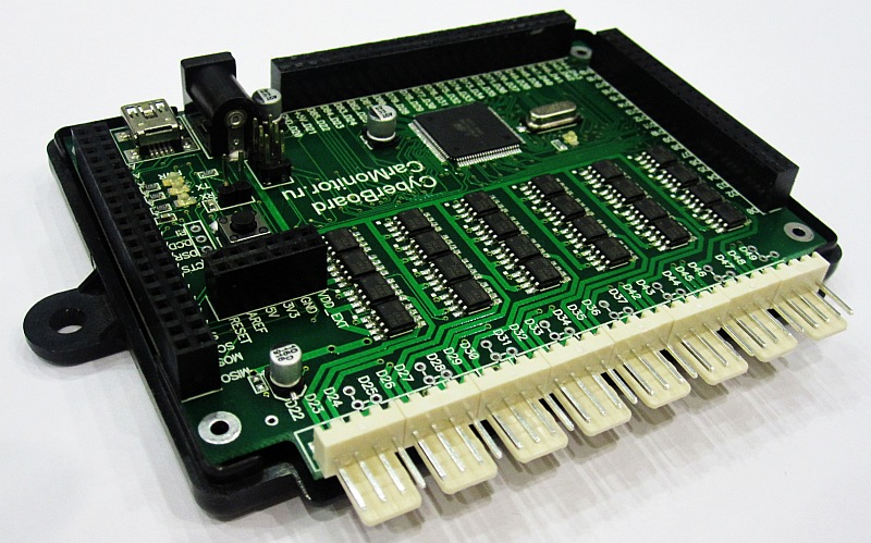 В отличии от Arduino MegaCyberBoard использует все возможности контроллера Atmega1280, а это значит что у CyberBoard 86 цифровых портов Ввода-Вывода и 24 из них можно использовать как силовые полу мостовые MOSFET ключи . Ток каждого из 24 каналов может достигать 4А и напряжение до 30в. Установленные на плате ключи дают возможность использовать CyberBoard во многих проектах и при этом не нужно ничего паять. Например Вы можете использовать плату в автомобиле, станкостроении, роботостроении и т.д. CyberBoard позволяет подключать электромоторы в мостовом режиме до 12шт. Биполярные шаговые двигатели до 6шт. Однополярные нагрузки в виде лампочек, нагревателей, электромагнитов, светодиодных лент и прочего до 24шт. CyberBoard имеет на плате место для подключения RFM12B трансивера, для беспроводной связи с другим устройствами CyberBoard разрабатывался под серийно выпускаемый и имеющемся в продаже пластиковый корпус CyberBoard можно использовать в качестве BitBang программатора