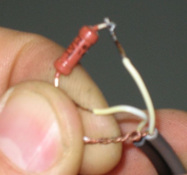 и кондерами по постоянному то (думал в этом проблема) цепь разрывал. Работает в одном случае ! который просто нереально выглядит — массы проводов соединяем — между центральными жилами резистор на 82 ома и… ! самое интересное — изображение становится стабильным и четким при ! зажатии сслегка влажными (не мокрыми а именно влажными) пальцами центральной жылы и массы в точке припайки резистора на растоянии 1см — как выглядит — фото (это именно как — провода для примера — моник в машине стоит)