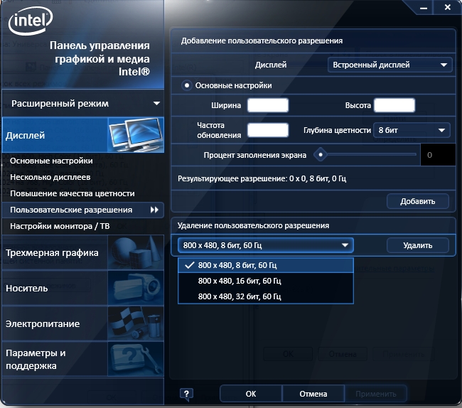 В утилите IntelGrafics можно создать пользовательское разрешение, оно добавляется в список пользовательский разрешений, но в обычный список разрешений это разрешение не попадает. Соответственно и переключиться в это разрешение не выходит.