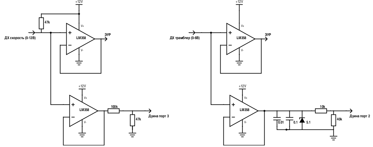 Проблема датчика скорости решена при помощи повторителя на ОУ. 47к резистор на сигнальном проводе подтянут к +12, оттуда же взят сигнал на БК. Дальше LM358 в режиме повторителя, на выходе сигнал в ЭУР. По осциллографу получился чудесный меандр и на входе, и на выходе. ЭУР на сигнал теперь никак не влияет, амплитуда сигналов с двух сторон ОУ честные 12В.