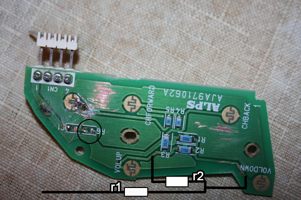 Ситуация такая. На руле 5ть кнопок, все на одной плате. Но мне нужно что бы 3и из них переключались между штатной ГУ и компом через реле, две всегда работали на штатной ГУ. Я решил перерезать дорожки по красным линиям и провести эти две кнопки отдельно до головы.