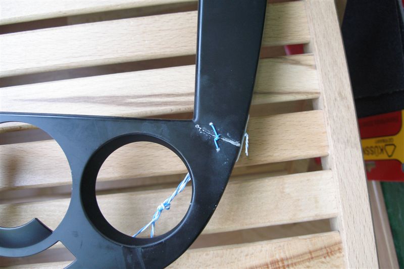 Поскольку у сломанной рамки была нарушена геометрия - засверлил несколько отверстий и натянул проволоку, вывел на глаз. Клеил эпоксидным пластилином.