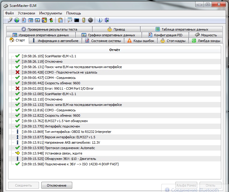 Посмотрел. У тебя происходит подхватывание сразу двух портов com3 и com4. А потом один дурит. Выбери порт в ручном режиме на протоколе KWP и поиграйся скоростью ([хотя 9600 для этого протокола -оптимальный вариант)
