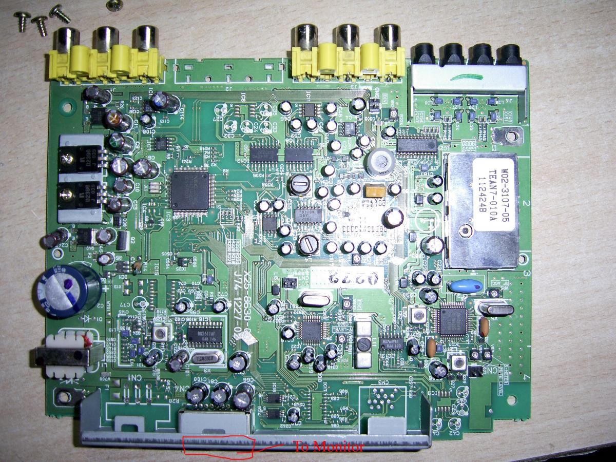 микросхема квадратная, блин, хоть бы по маркировке поискал... слева под тюнером ниже синего кварца. ищи на нее даташит, по даташиту выход РГБ и от него дорожки до разъема отслеживай, насколько я помню, они проходят через 2 маленьких микробы возле разъема
