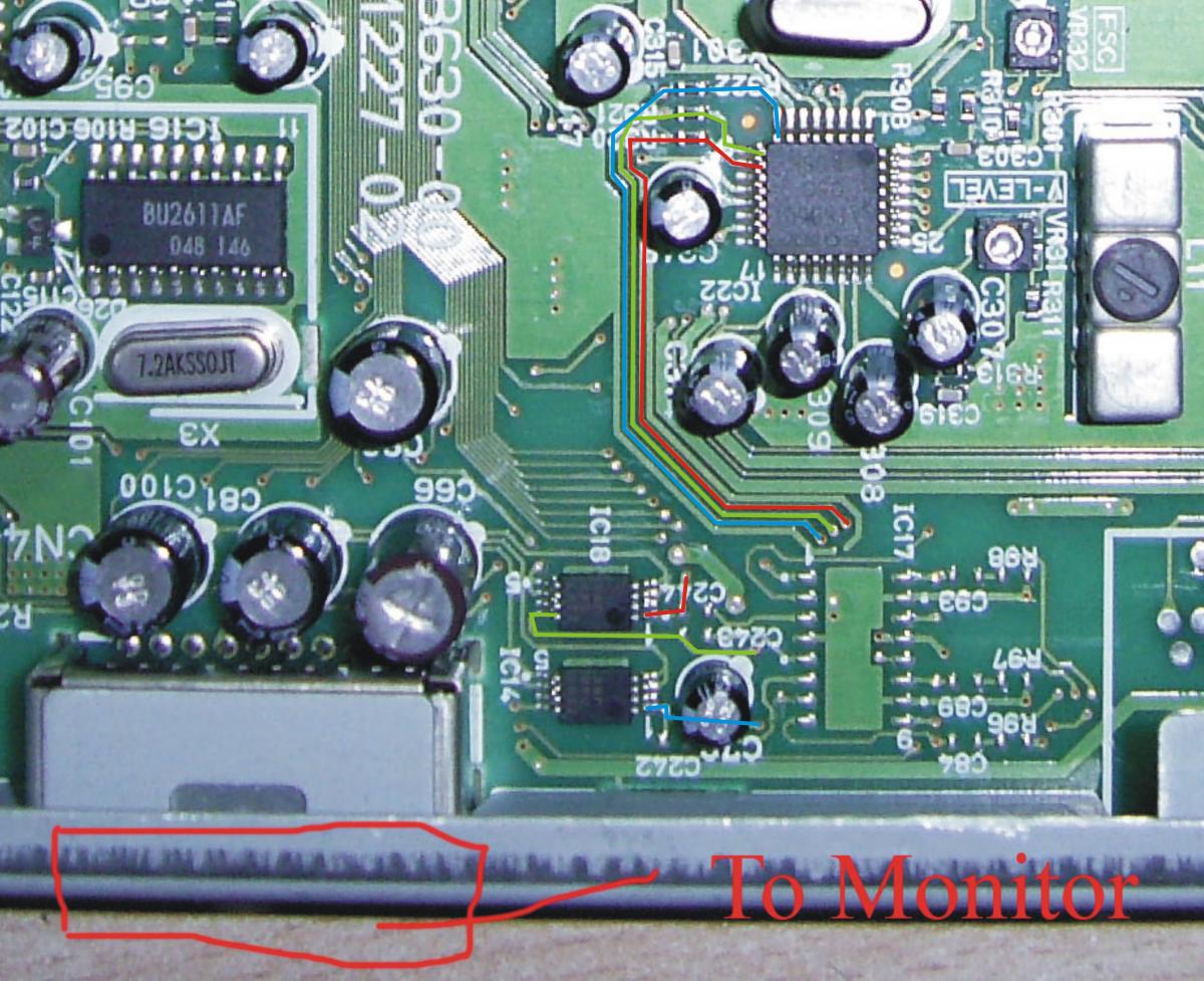 нашел С RGB Понятно.... а которая синхра нужна??? И как лучше здесь на ножки паять или как вы говорить найти куда они уходят..... просто с моим знаним схем, сомневаюсь что найду, или есть возможность прозвонить????