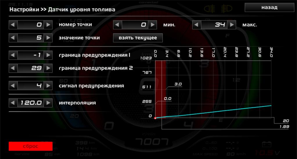 - Настраиваемый порог и цветовая индикация низкого уровня топлива.