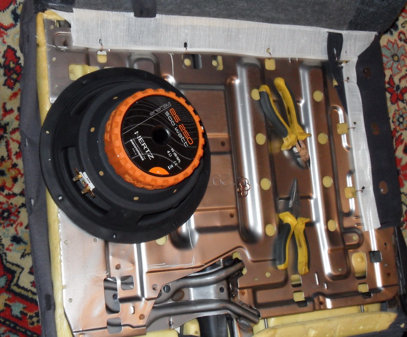Дома залежался подаренный 10" саб Hertz ES250, вот решил его как-то приобщить к делу. Долго выбирал вариант установки, ввиду особенностей моего авто, и остановился на установке за задним сидением в районе подлокотника.