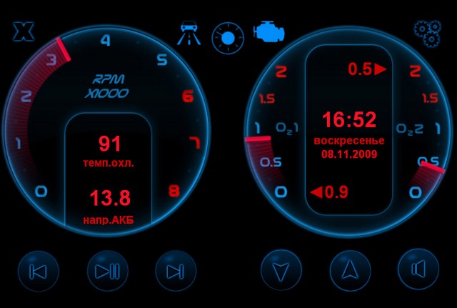 Также в программу добавлена поддержка выбора различных скинов. Описания для различных скинов вынесены в отдельные текстовые файлы. В данной версии программы будет возможно выбрать необходимый набор отображаемых главных индикаторов, расположение индикаторов, размеры стрелок и многое другое. Текстовая информация внутри индикаторов полностью настраивается - расположение, тип выводимого параметра, размер шрифта, оттенок и т.д.