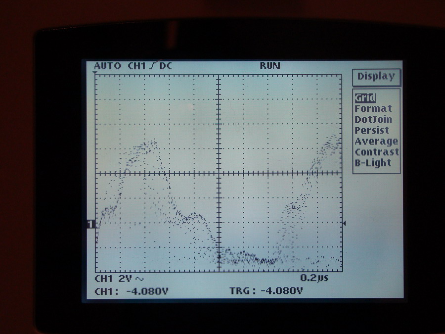 Вот фотки с осцилографа: сначала две осцилограммы на 11 и 14 ногах SG3525 без нагрузки, потом тоже самое - под нагрузкой (резистор 4,5 Ома)