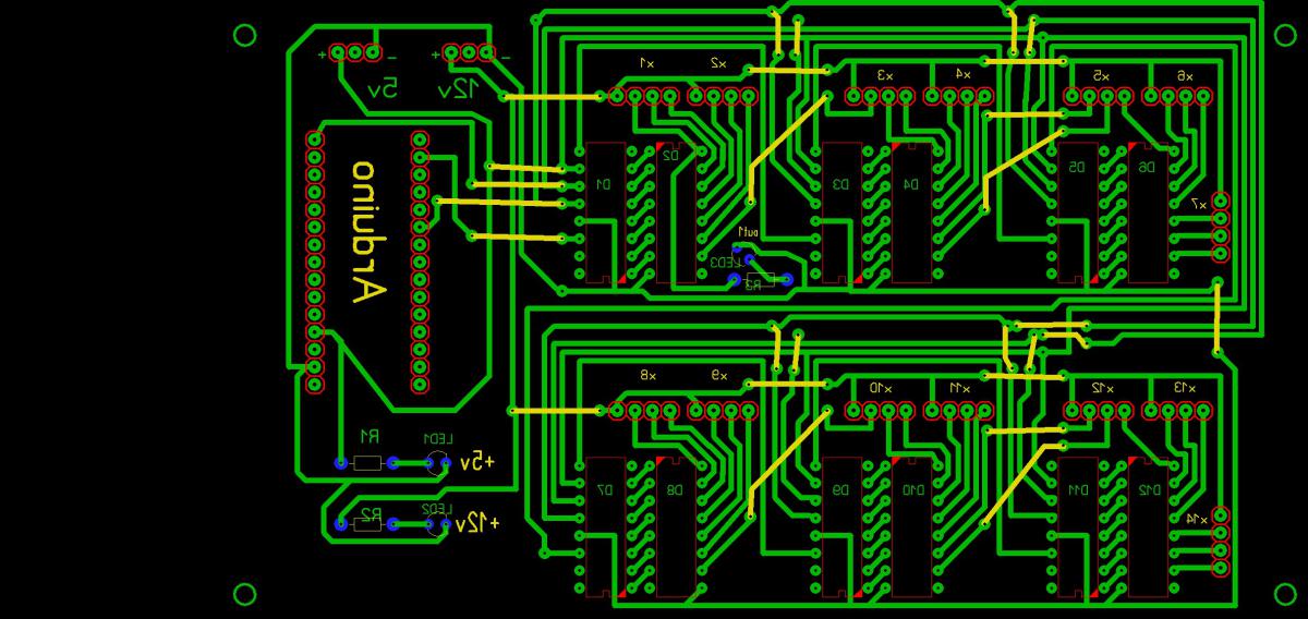 Вот что у меня получилось с DIP корпусами. Изначально делал под односторонний текстолит с перемычками, потом нашёл кусок двухсторонний и кое что допилил.