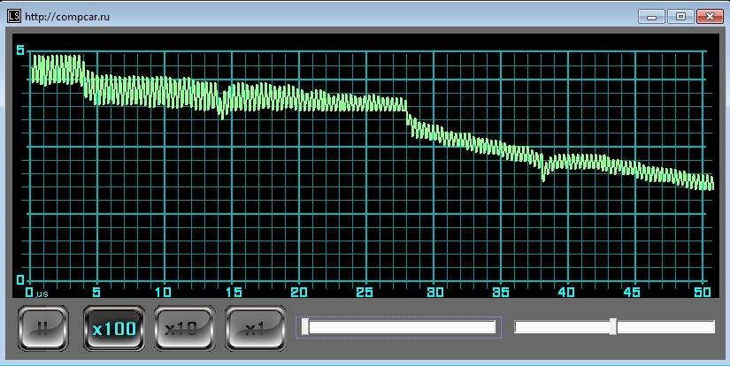 Ну все верно, от 0-10 (10 делений) * 100 = 1000 мкс или 1мс. Кстати у тебя тоже посторонние сигналы всплывают? На стационарном осцилографе никаких помех нету, чистый сигнал. Замеряю сигнал шим 5v 50Hz low=18,5мс high=1,5мс сигнал скачет ужасно, бегунок синхронизации не помогает, вылавливаю картинку паузой. Я думаю изза того что длинноватый сигнал и не вмещается в рамки/длинну шкалы проги. И еще: Какая чувствительность входа? если сигнал 5v нужен делитель? Я запускал на прямую, пробовал с щупом 1:10 на выходе полный бред.