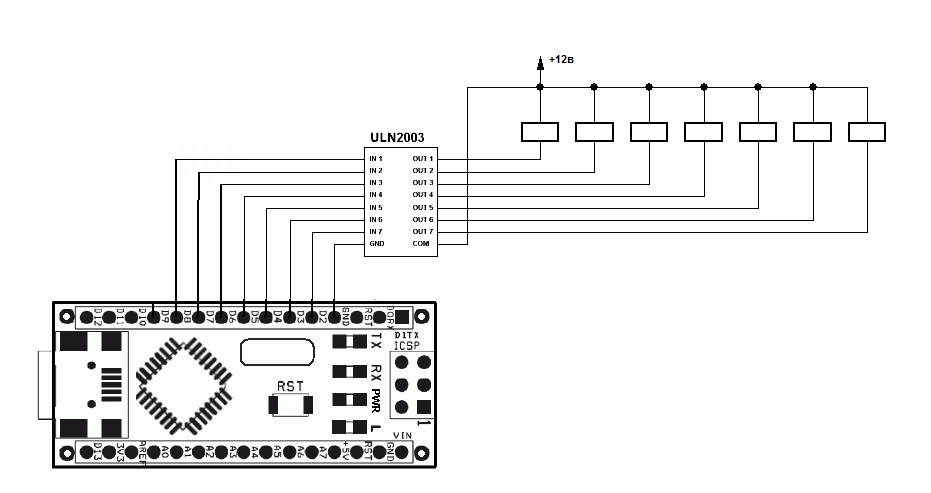 Здравствуйте. есть вопрос приобрел сarduino v5, микросхему uln2003an и реле omron g5le-14... собираю схему по рисунку, а где в неё минус сarduino питается от usb там 5 вольт. а вот реле как будет срабатывать?