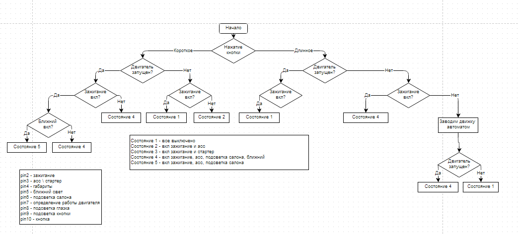 Логика работы на блок схеме. Постоянная проверка зажигания, т.к. движку мог завести в автозапуска. В планах собрать KeyLess систему со своей логикой работы))