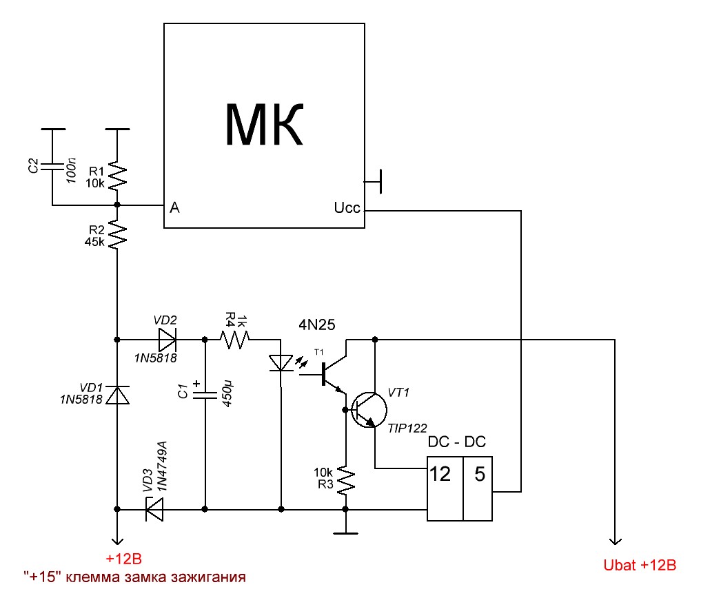 как-то непонятно. по схеме получается, что при включении зажигания идет питание на dc. что мешает запитать напрямую от 15 клеммы без оптопары и транзистора? для защиты АЦП входа неплохо бы минимум стабилитрон параллельно конденсатору C2. и еще защитный диод по входу до делителя. учти, что напряжение на vd1 повлияет на показания, это надо учесть программно. по питанию тоже не помешает диод и конденсторы.