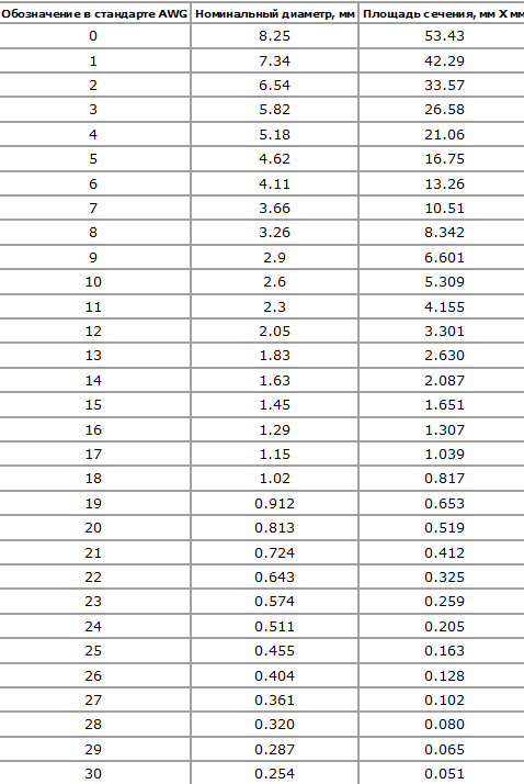 Таблица соответствия американского стандарта AWG международной метрической системе