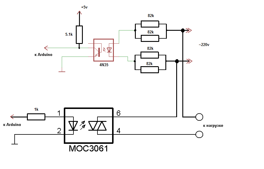тогда, я так понимаю, 4 ножка оптрона пойдет на нагрузку, 6-тая + резисторы (те что для отсечки) - 220В, вторая пара резисторов тоже в 220 и на нагрузку.. верно?