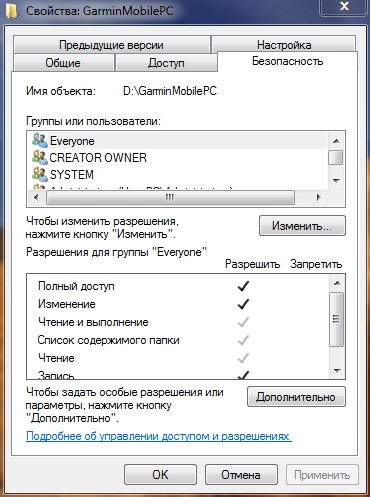 4. Если у вас Vista или Win7 сделайте полный доступ к папке GarminMobilePC для группы Everyone.