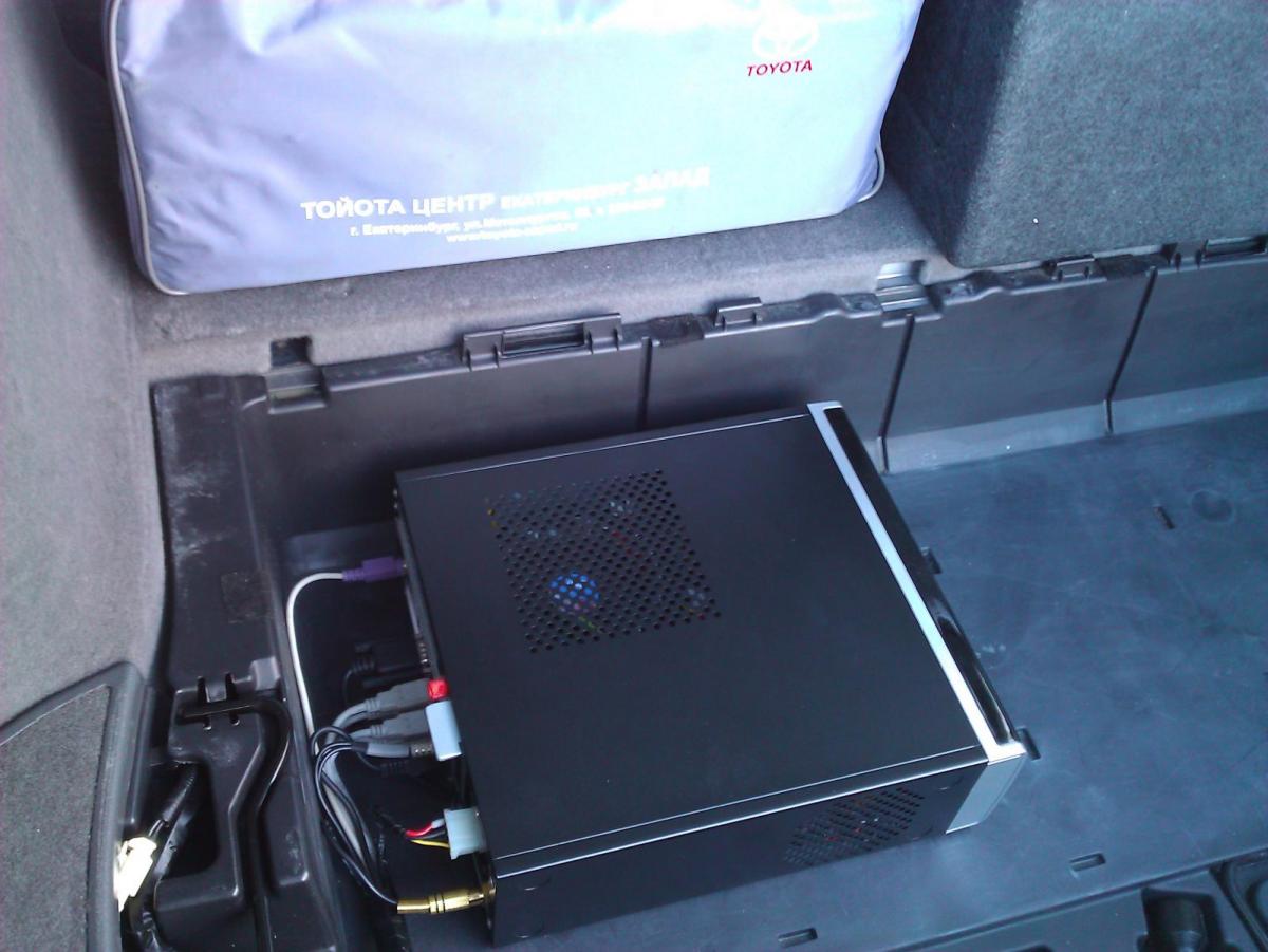 Разместил в багажнике, в пластиковом коробе, закрывающем запаску. Системник крепится на застежках "липучках", что позволяет его быстро и легко снять/поставить в течение минуты.