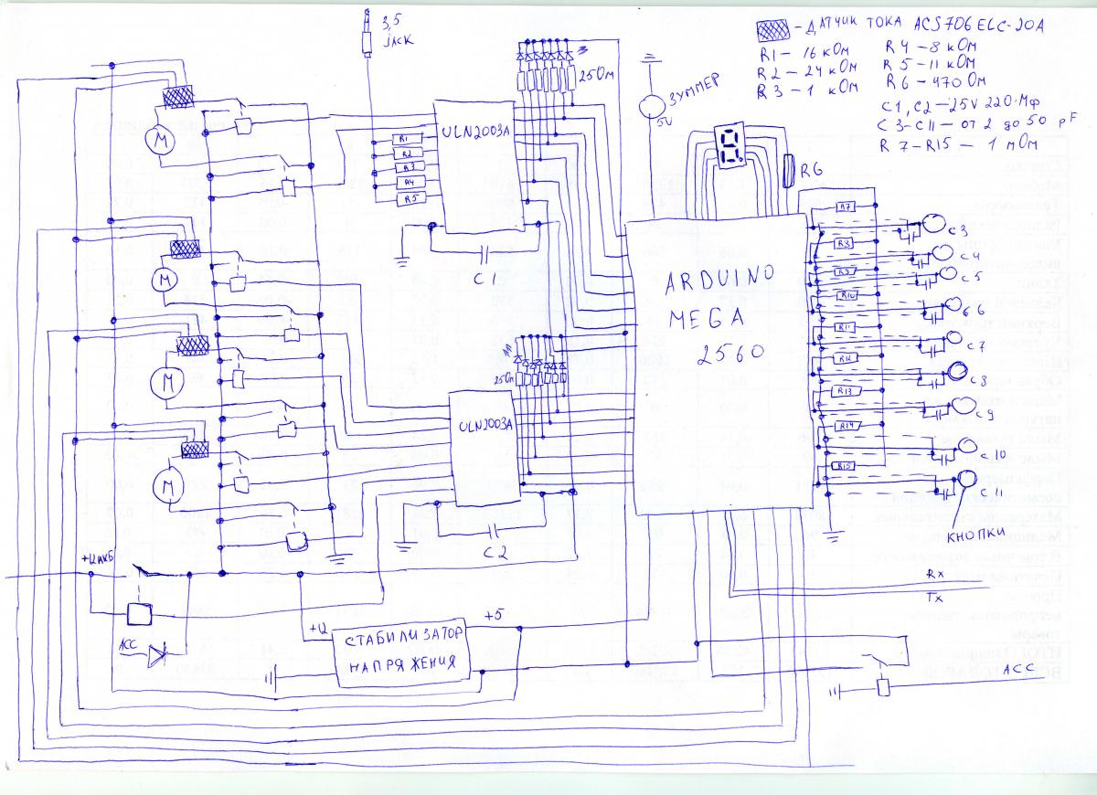 Всего 9 кнопок, по 2 на каждую дверь и 3 на дверь водителя. На всех дверях функция атомата которая срабатывает по двойному клику, почму двойному, по тому, что может получиться эффект скольжения. Те кто ставили доводчики сктекол с функцией автомата, поймут меня (стекло очень трудно подогнать в то место в которое хочешь ), а тут гоняй сколько хочешь . Автомат и вуерх и вниз. И только по двойному клику, на практике посмотрим как это будет выглядить. В водительской двери третья кнопка, будет иметь функцию переключателя. Например нажатие на 2 секунды на табло загорается соответствующий диод или цифра (пока еще не определился) и уже с водительской двери можно будет управлять любым стеклоподъемником, в зависимости от цифры или индикатора. А если ее зажать на 4 секунды то сработает режим блока, все три стеклоподъемника закроются и заблокируются, а водитель сможет ими управлять путем 2-х секундного переключения между ними. Tще была мысль, поставить бипер с условными сигналами, было бы удобно. Еще можно будет управлять магнитолой. На рисунке, на втором, который я нарисовал от руки, я нарисовал сдвиговый регистр, от которого я отказался, так как у меги вполне хватает выходов и все управление магнитолой, можно будет сделать на одной плате с минимальной разводкой. Управлять я смогу громкостью, переключениями треков и тишиной. Все это работает через блютус. Сначала нано принимает сигнал, а потом по Тх и Рх посылает на мегу, а та в свою очередь управляет магнитолой. Так же с телефона по блютус можно будет управлять и стеклоподъемниками, но только по парам и по сторонам и то, только в крайних полождениях, либо открыть, либо закрыть. Еще думал, но уже в качестве прикола, попробывать сделать при одновременном зажатии 2-х кнопок, на любой из задних дверей, на 2 секунды, отключение управления стеклоподъемником и подключением функции управления магнитолой. Например громгостью! При отключении питания, (постановке на сигнализацию) ардуино будет видеть это и закрывать все стеклоподъемники, по парам или нет, еще не определился и отключаться путем, отключения питания на транзисторе, который будет отключать полностью питание, на всем устройстве! Естесственно, при обрыве тросика, стеклоподъемник будет работать в ту или иную сторону, не более 10-15 секунд, а потом отклюаться.