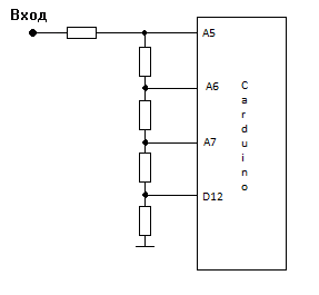Переводим выводы A6, А7, D12 в третье состояние(высокий импеданс) , то есть настраиваем их на вход. Для изменения сопротивления делителя переводим нужный вывод на выход и выдаем на нем LOW . И того получится четыре разных делителя Вложение 9866