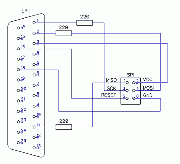 Для прошивки бутлодера из под Arduino-IDE, придётся собрать простенький программатор. Длина проводов программатора не должна превышать 15см
