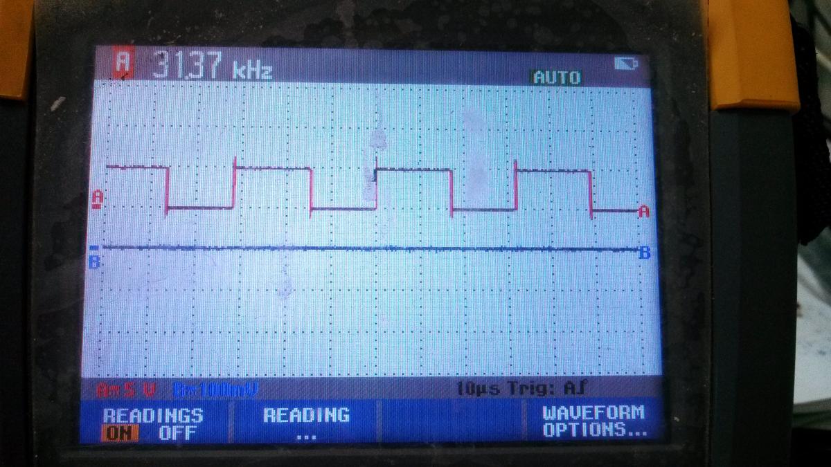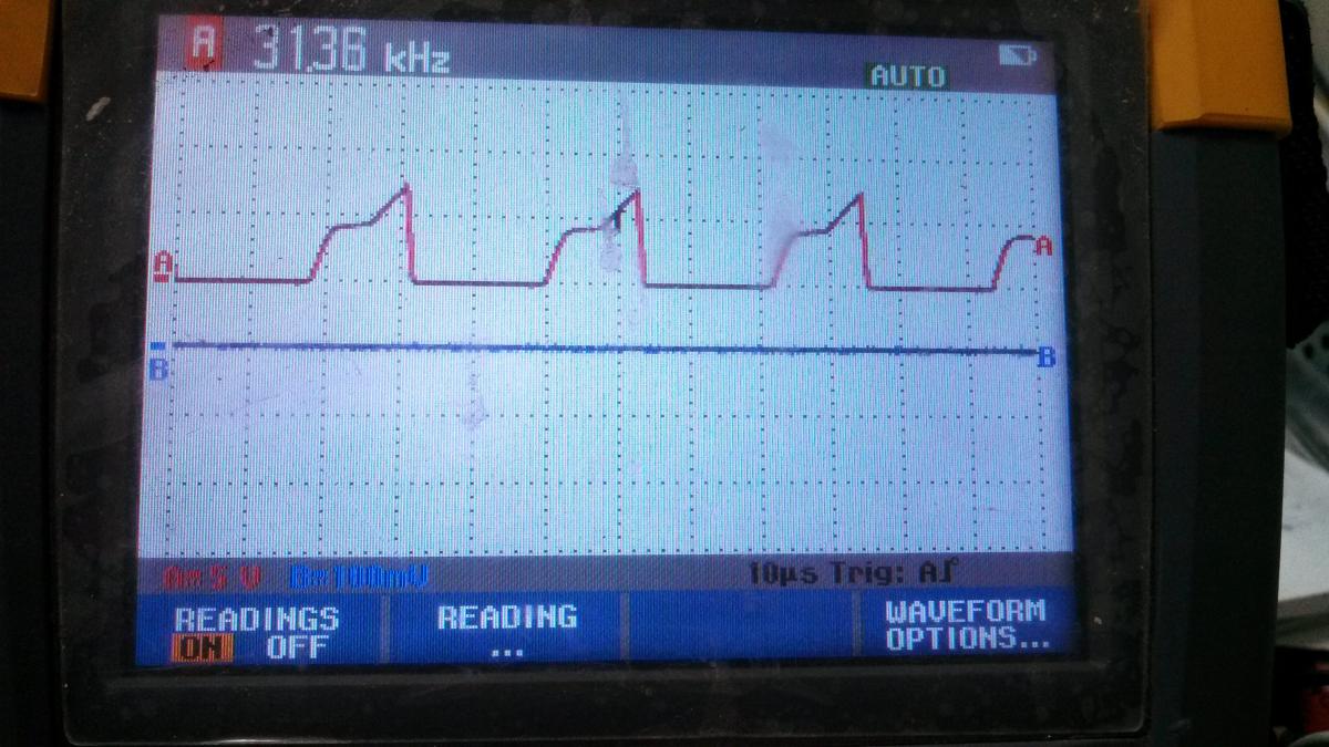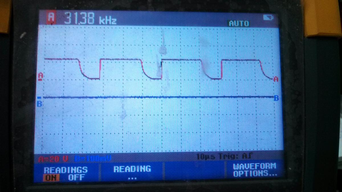 Уменьшил до 2кОм . Но все равно греется. Пробовал уменьшать частоту до 3кГц и 490 Гц. Пробовал заменить полевик на FB9N65A у него вроде емкость меньше - то же самое. Вот что на затворе