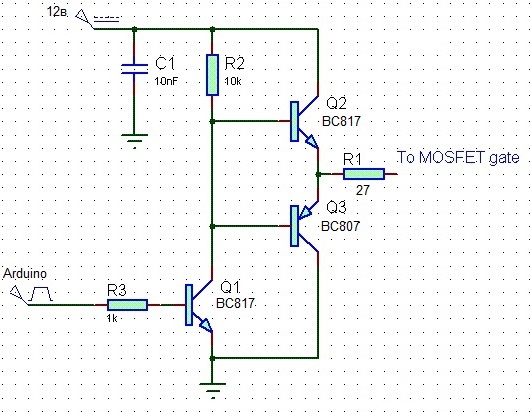 Ну последовательно затвору я добавил резистор 4,7к и сток подтянул к земле 10к