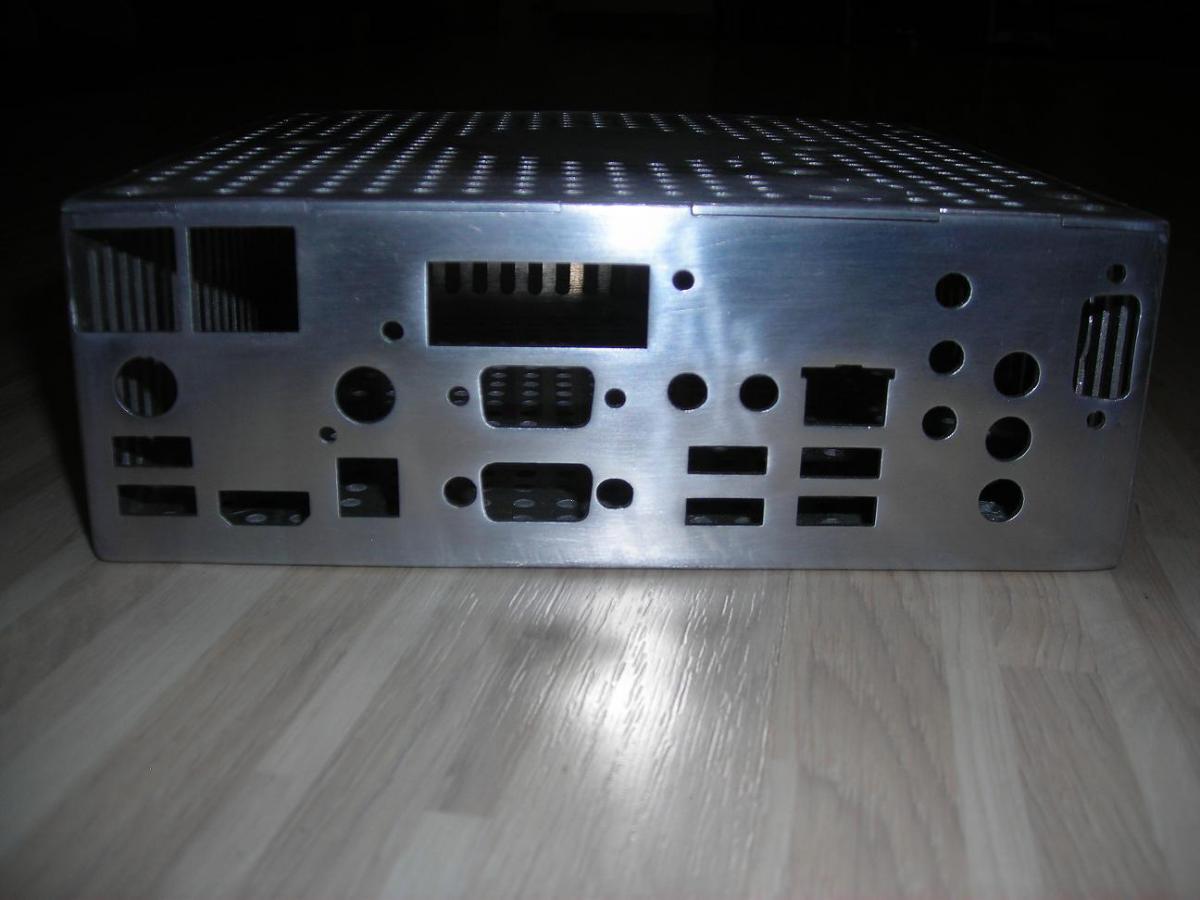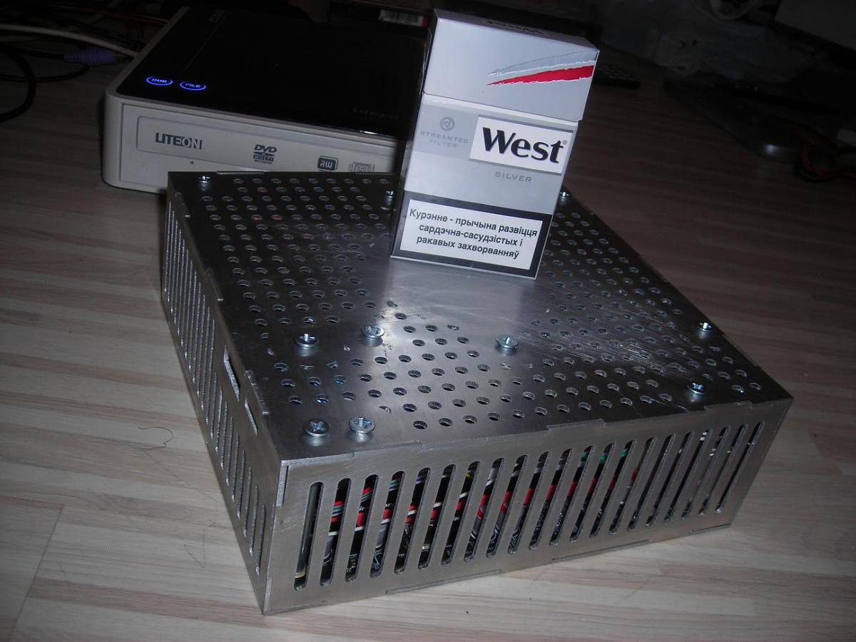 Крпус полностью самодельный, размеры 178х182х62мм (почти DIN1 :-)), материал - 2мм аллюминий.