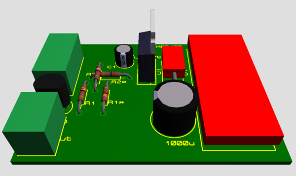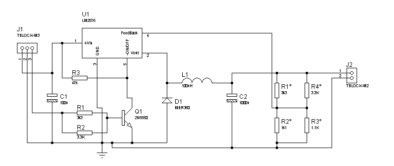 Детали лежали месяц и наконец сел и развел платку, LM2576-5.0 в TO220, дроссель на колечке из БП (27 мм диаметр), провод 1 мм2, столько, сколько вошло . Делал все в Протеусе, в архиве приложенном все есть. Делать решил не на фиксированный вариант ЛМ-ки, а на регулируемый... Вообщем вот что получилось. По два сопротивления в параллель, опять же для универсализации, одно из них выводное, другое SMD 0805, снизу платы. В качестве коннекторов предполагаю использовать клемные колодки 30x серии. Использовал вход шатдауна для отключения схемы, пока не придет сигнал на 3 вход первой колодки. В принципе эту часть можно исключить и просто закоротить 5 и 3 ногу ЛМ-ки. Если у вас будет фиксированная версия ЛМ, то нужно запаять перемычку вместо R2* или R3*. R1* или R4* нужны для аджастовой версии, для организации делителя обратной связи, при фиксированной МС их не распаиваем. R1 или R2 запаиваем 10-40 кОм. Подягивающий R3 40-50 кОм. Q1 любой NPN в TO92. Размеры платы 40*55 мм. Все уперлось только в дроссель