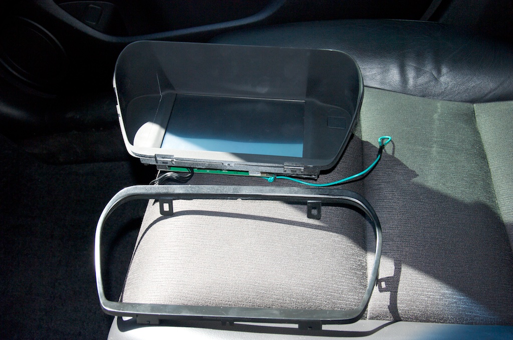 А с рамкой для основного монитора пришлось немного повозиться. 7 дюймов все-таки немного многовато для нее, но только по высоте. Пришлось на пару см приподнять верхнюю часть. После двух дней сидения дома и небольшого количества эпоксидки с наждачкой вышло очень даже симпотично. С покраской сам решил не заморачиваться и отдал рамку своему другу маляру у него явно лучше получилосьКрасили какой-то авто эмалью с добавлением матовой присадки. У Accord'ов родной мониторчик прикрывает стекло, а хотелось то и пальцами в монитор потыкать