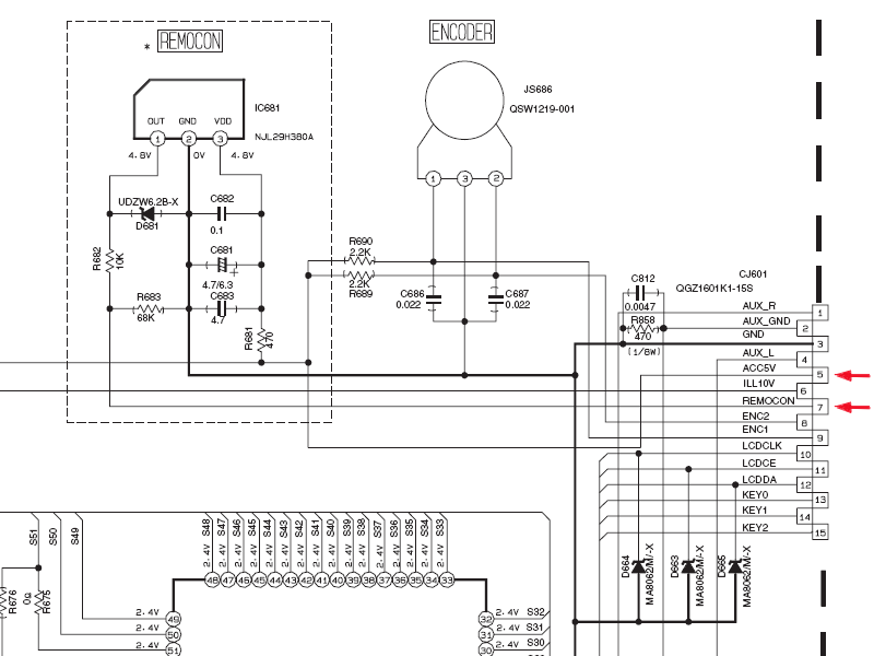Хотел спросить форумчан кто точно знает как включаеться магнитола без передней панели. В моем случае это JVC KD-G342 но это не так важно. На схеме видно что сигнал АСС+5 идет на микросхему IC 681 которая в панеле наглухо отсутствует только место в плате для нее. Ввиду этого я решил что сигнал АСС+5 при монтаже панели идет на прямую к REMOCON. Вопрос: достаточно будет перемычки между этими пинами или все таки резистор надо поставить?