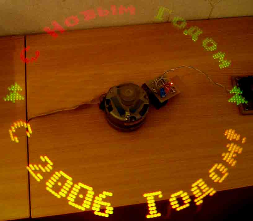 Принцип простой , магниторезистивный датчик синхронизирует контроллер, а он считает время оборота колеса и делит его на равное колличество частей(пикселов), ну и в каждай момент времени включаем сэмпл вертикального отражения изображения.