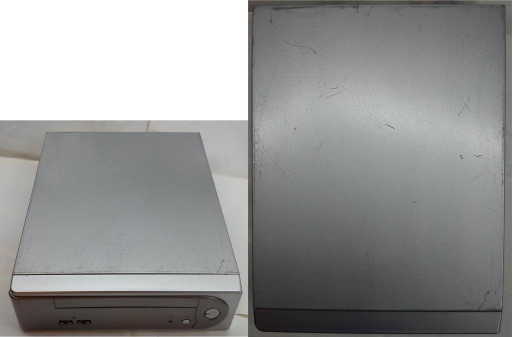 Чёрный корпус. Метал тонкий. Имеются потёртости и царапины. Примерные размеры корпуса. Ширина 23см, глубина с панелью 23см. Высота корпуса 7см. Спереди один разъём USB и два гнезда на 3,5мм для наушников и микрофона. В корпусе довольно мало места. Можно разместить лишь пару ноутбучных HDD по бокам.