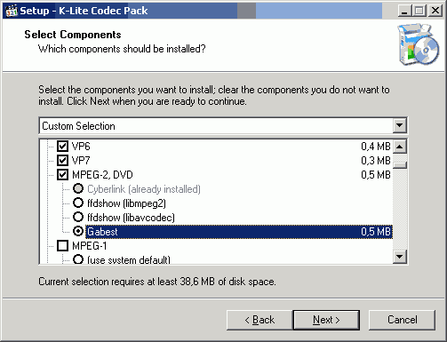 При инсталляции выбираем опцию MPEG-2, DVD и кодек Gabest.