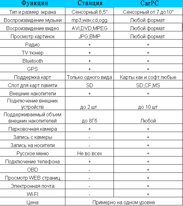В данной таблице сравнение характеристик мультимедийной станции и CarPC.