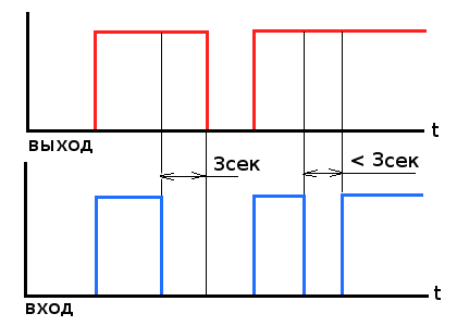 2. Приходит 0 - реле остаётся замкнутым еще 3 секунды, после чего, если за 3 секунды не появилось +12, реле размыкается. Соответственно, если в течение 3 секунд появилось +12, то реле не размыкается.