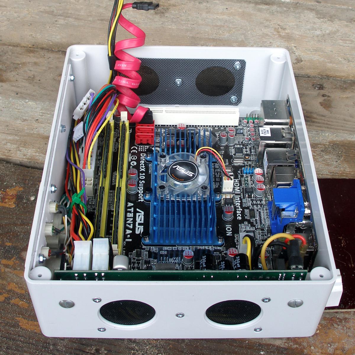 Чипсет - nVidia ION, процессор - двухядерник Intel Atom 330(Потребление - 8Вт), 2 модуля памяти DDR2-800 (до 4 ГБ включительно), интегрированная графика на базе GeForce 9400M (выходы D-Sub и HDMI), слот PCI, десять портов USB 2.0 (8 на задней панели и 2 через разъем на плате), три порта SATA300, плюс один порт eSATA на задней панели, порт PS/2 для подключения клавиатуры, интегрированный звук на базе 8-канального HDA-кодека VIA VT1708S,сетевой контроллер Realtek RTL8112L 1000 Мбит/с, Bluetooth. Все, что нужно и ничего лишнего.