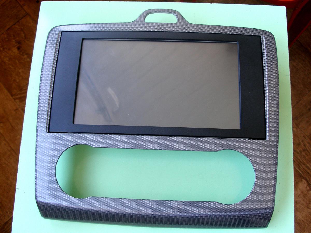 Торпеду авто решил не ломать однозначно, чтобы все можно было без проблем вернуть назад. Да и не стоит это развлечение того, чтобы из за него машину уродовать. Модернизации подверглась только рамка с квадратным отверстием вокруг штатного места магнитолы. Матрица монитора вписалась в проем рамки идеально. Для того , чтобы закрепить плату монитора, к рамке были приклеены дихлорэтаном несколько пластмассовых пластинок, выточенных из оставшихся заглушек отсеков настольного компа. Купленная на радиорынке 2Din накладка для этой рамки подошла под видимую область матрицы идеально. Планирую покрасить ее в серебристый цвет, в тон с климатом. Хотя и так ничего. Монитор запитал от блока питания компа, мощности хватает. Моник включается и выключается вместе с компом, поэтому кнопки его я никуда выводить не стал. Единственно, что я планирую - это вывести на лицевую панель фотодатчик пульта ДУ, чтобы регулировать яркость подсветки.