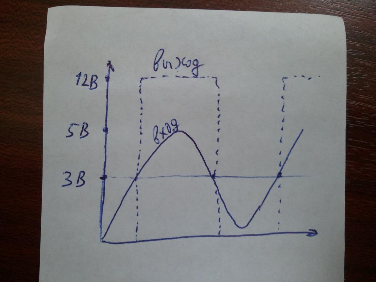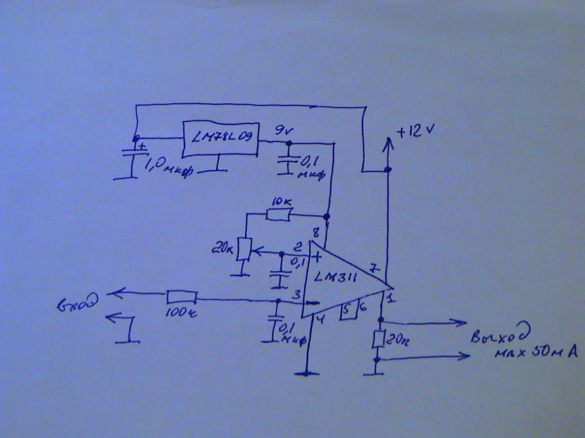 На вход схемы поступает напряжение от 0 до 5в. При определенном уровне входного сигнала на выходе схемы появляется управляющий сигнал 12в . Порог срабатывания ( от 0.5 до 4.5в) должен регулироваться переменным резистором. Питание схемы - от сети автомобиля.