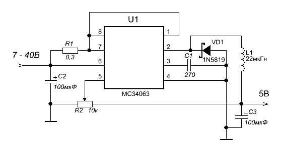 Схема преобразователя классическая на микросхеме MC34063