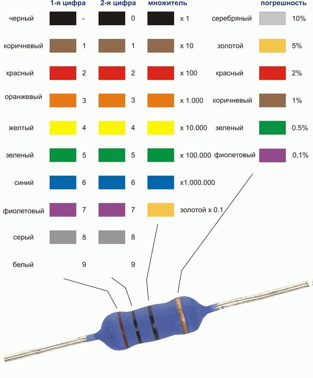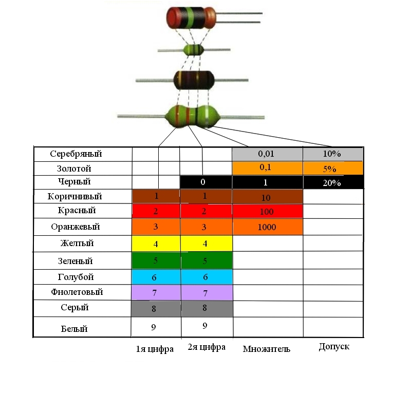 Таблица определения сопротивления резисторов по цветовой маркировке.