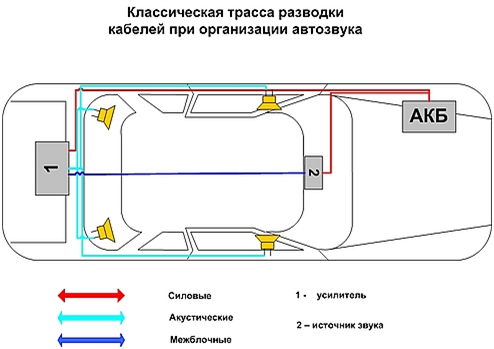 Это теоретическое.. на практике не всегда получается к примеру протянуть межблочники прямо посередине кузова.. по центральной консоли напрямую к мафону. Чаще всего они прокладываются по коробу задней арки.. выходят к порогу около задней двери и тут есть два пути. Или поворачиваем вдоль заднего сиденья и далее по центральной консоли..или тянем по порогу до переднего сиденья и протягиваем межблочник вдоль лонжерона к центральной части и потом наверх к мафону... Сторону по которой все это делаем выбираем противоположную от трассы силовых кабелей. По акустическим проводам все банально - тянем там где удобно. Единственно правильно выбрать сечение. Обычно 2.5 кв.мм. достаточно с запасом. Лучше брать витую пару в отдельной изоляции (менее подвержена электромагнитным наводкам)