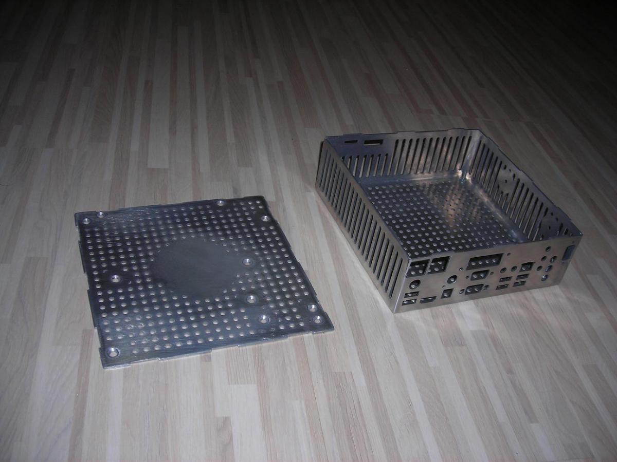 Крпус полностью самодельный, размеры 178х182х62мм (почти DIN1 :-)), материал - 2мм аллюминий.